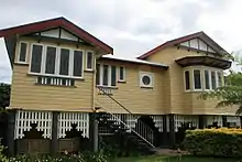 The street elevation of See Poy House was typical of an interwar Queenslander house; however its materials and special features reflect the wealth and standing of the family.[8] It was noticeably larger than a standard house at 670 square metres (7,200 sq ft) in area and featured specially selected timbers (black bean, white hickory and silky oak), brass fittings and leadlight windows. During construction, rough sawn hardwood timber was transported from Maryborough and dressed on site. The use of mortised joints and anchor bolts cyclone-proofed the house. Leadlight windows and 12-foot (3.7 m) high ceilings were notable features of the interior of the house. It comprised a typical room format for a large interwar house being formal dining and lounge rooms, main bedroom, bathroom, second bedroom, study and kitchen. Verandahs were located on both sides and at the rear of the house. Balustrades were solid, other than decorative timber batten panels centred beneath timber bracket arches with side openings. The battening pattern used was consistent throughout: below arched openings and on the front stair balustrade in the infill latticework. The house cost between £1,200 and £2,000.[1]