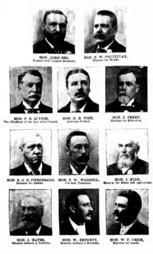This was the first occasion in which ministers were appointed to the Executive Council (or cabinet) without responsibility for a department or portfolio.[7] It was initially 2 ministers James Hayes,[8] and Walter Bennett,[9] with John Fegan added in 1903.[10] They were not paid in addition to their allowance as a member of parliament,[lower-alpha 2] did not have an "office of profit" and were not required to recontest their seats at a by-election.[7]