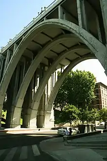 The Segovia Viaduct is a viaduct in the La Latina neighborhood in Madrid, Spain. Throughout the centuries the area has been a major crossroad. The bridge's main function has been to facilitate access between the town and the Royal Palace of Madrid. A later version was built in 1934 to replace the previous iron one erected in 1874. The present one is the result of many restorations in order for its structure to accommodate the growing traffic demand. It spans Segovia Street, 25 meters below, from which it takes its name, although it is popularly known as "El Viaducto". Throughout its history, it had been a common site for suicide in Madrid until 1998.