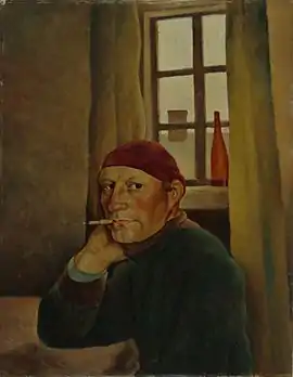 Vilho Lampi created several self-portraits. In this image the artist is sitting at a table and smoking a cigarette.[2]