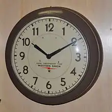 The relationship between the two separate companies began with an agreement between Self Winding Clock Company and Western Union (WU) being entered into in June 1889.[8] This agreement was for the transmission of time signals over Western Union telegraph lines to synchronize clocks made by Self Winding Clock Company. SWCC owned the clocks and WU installed and maintained them for a monthly fee, ranging from $1.25 to $2.00 per clock per month. SWCC was paid a percentage of the rental fee for providing clocks for the WU customers.[9] If the clock movements required major repairs, they were sent to a SWCC repair facility and a replacement movement was installed by WU at the customer location. The partnership between SWCC and WU ended in 1963 when, as part of a lawsuit settlement, WU purchased all the rental clocks from SWCC. By the late 1960s, the time-service business had run its course and ceased to be profitable. Most of the clocks were simply abandoned. These clocks are sought after by many clock collectors.