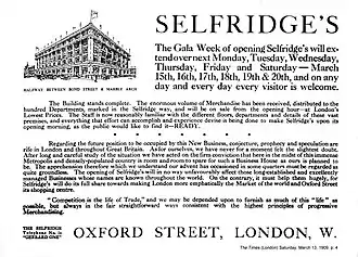 - "Selfridge's / The Gala Week of Opening". The Times. London. 13 March 1909. p. 4.