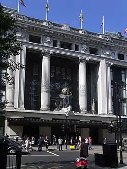 American architect Francis Swales, who trained at the École Nationale Supérieure des Beaux-Arts in Paris, was briefed to design the frontispiece. Aided by British architects R. Frank Atkinson and Thomas Smith Tait,[7][9] the final design was highly influenced by John Burnet's 1904 extension to the British Museum.[5] The steel supporting columns are hidden behind Ionic columns, to create a facade which present a visually uniform, classical, Beaux-Arts appearance.[10] The distinctive polychrome sculpture above the Oxford Street entrance is the work of British sculptor Gilbert Bayes. The final frontage, through use of cast iron window frames to a maximum size of 19 feet 4 inches (5.89 m) by 12 feet 0 inches (3.66 m), means that both the Oxford Street and Duke Street frontages are made up of more glass than stone or iron works.[8]