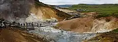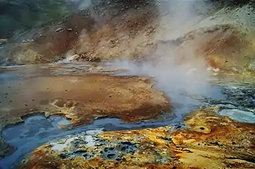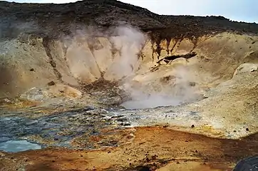 The hot springs area contains solfataras, bubbling mud pools, fumaroles, hot springs and warm springs. The high sulphur content of the springs give them a characteristic yellow-orange color. Sulfur was mined at this location until the 1880s. An explosion caused by nearby drilling took place in 1999 that opened up a large crater vent. In 2010 and 2019 other explosions took place, spewing hot mud, water and steam over the area.[1] A boardwalk with viewing platforms has been constructed over the area.[2]