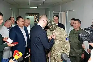 On August 21, 2014 by the decree of the President of Ukraine Petro Poroshenko, Semenchenko was awarded the Bohdan Khmelnytsky Order, Third class for "personal courage and heroism shown during protection of the state sovereignty and territorial integrity of Ukraine, dedication to loyalty oath, highly professional execution of his duty".[29][30] He was awarded for the service in the battle shown while liberating the cities of Artemivsk, Popasna and Lysychansk. On September 1, 2014 the Order was handed together with a service gun — the Makarov pistol from the Head of SBU.[31][32]