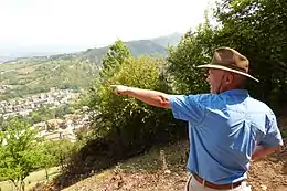 In April 2005, Osmanagić was invited to visit Visočica and its fortress ruins. During the visit Osmanagić noticed the pyramidal shape of Visočica hill.[1] He subsequently wrote a book promoting the claim that the hill was the remains of an ancient, man-made pyramid, which he claimed was one of five colossal stone structures in the shape of a pyramid with an extensive prehistoric tunnel network. He named those structures "Bosnian pyramids", and established a charitable foundation, the 'Archaeological Park: Bosnian Pyramid of the Sun Foundation', to fund the promotion and investigation of the site. Osmanagić claimed that he wished to excavate in order to "break a cloud of negative energy, allowing the Earth to receive cosmic energy from the centre of the galaxy".[11]