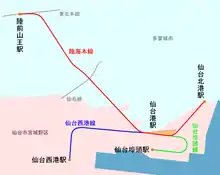 The map of Rinkai Main Line, Sendai West Port Line, and Sendai Pier Line.