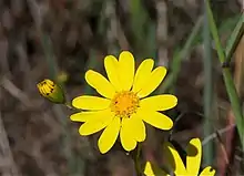 The inflorescence produces one to ten or more flower heads, which are lined with usually about 21 black-tipped phyllaries. They contain many yellow disc florets and each has usually 13 yellow ray florets about a centimeter long.[1] The bloom period is March through May.[2]