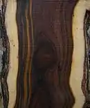 Flowers occur as clusters of off-white or cream-coloured terminal spikes which are fragrant and bloom during spring and summer.[1] The timber, resembling that of Acacia melanoxylon, often has heart rot, but when sound is of good quality and handsomely streaked in black, dark brown, purple and cream, with markedly contrasting off-white sapwood.
