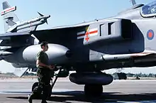 The Jaguar is an orthodox single-seat, swept-wing, twin-engine monoplane design, with tall tricycle-type retractable landing gear.[5] In its original configuration, it had a maximum take-off weight in the 15 tonne class;[27] with a combat radius on internal fuel of 850 km (530 mi), giving the Jaguar a greater operational range than competitor aircraft such as the Mikoyan MiG-27.[28] The aircraft had hardpoints fitted for an external weapons load of up to 10,000 lb (4,500 kg).[27] Typical weapons fitted included the MATRA LR.F2 rocket pod, BAP 100-mm bombs, MATRA AS37 anti-radar missiles, AIM-9 Sidewinder missiles, and Rockeye cluster bombs.[29][30][31] The RAF's Jaguars gained several new weapons during the Gulf War, including CRV7 high-velocity rockets and American CBU-87 cluster bombs.[32] Finally, the Jaguar was equipped with either a pair of French DEFA cannons,[33] or British ADEN cannons.[34]