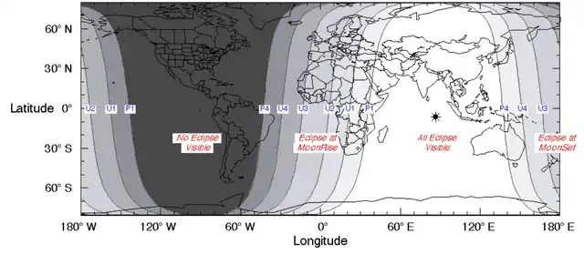 It will be completely visible over much of Asia, Australia and eastern Africa, will be seen rising over the rest of Africa and Europe, and setting over eastern Asia and New Zealand.