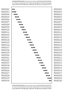 The data presented in this example was simulated by WinBasp. Initially 60 contexts (called units in WinBasp) were created along with 50 types. The contexts were labeled in chronological order by numbers 01 to 60, the types are labeled in the form T00001 to T00050. If a type is represented by one object only this object is not relevant for the chronological sequence as it does not provide a link to another context. Similarly, contexts containing one object only are irrelevant for seriation. Therefore, the contexts with one or no object and types represented by one object or not at all were eliminated. The resulting raw simulated data consisting of 43 contexts and 34 types are shown on the left. As expected, the dots indicating the occurrence of a type in a context are close to the diagonal of the table.