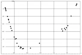 Kendall (1971) applied multidimensional scaling to the cemetery data of Münsingen. The resulting scatterplot showed the form of a horse-shoe where the graves were arranged on the curve according to their chronological order. Similarly, a mapping of the component scores for the first two axes of the correspondence analysis result will display a parabola if the design styles considered are controlled by one factor only (like chronology). This is called the arch effect by Hill and Gauch (1980).[8] Both Kendall and Jensen & Høilund Nielsen (1997) created artificial data sets to show that the parabola results in ideal circumstances. Therefore, it is recommended inspecting the scatterplot of the first two axes of correspondence analysis to find out if other factors play a role as well (see Examples 2 and 3).