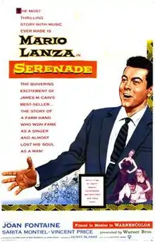 Serenade is a 1956 film directed by Anthony Mann and starring tenor Mario Lanza, Joan Fontaine, Sara Montiel (billed as Sarita Montiel), and Vincent Price. Based on the 1937 novel Serenade by James M. Cain, the film was a Warner Bros. release, Lanza's fifth film, and his first on-screen appearance in four years.