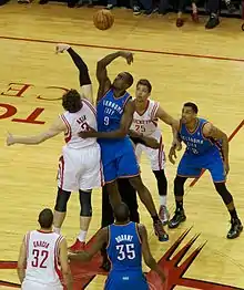 After the lockout, Ibaka returned to the NBA from Spain. On 19 February 2012, he recorded his first career triple-double against the Denver Nuggets, scoring 14 points, grabbing 15 rebounds and getting a career-high 11 blocks.[17] He played all 66 games in the shortened season as a starter, averaging the most blocks in the league, 3.6 per game. In voting for the Defensive Player of the Year, he finished second behind Tyson Chandler of the New York Knicks.[18] In Game 4 of the Western Conference Finals against the San Antonio Spurs, Ibaka went 11–11 from the field. Oklahoma City went on to win the series in six games and advance to the 2012 NBA Finals. In the Finals Ibaka averaged 7 points and 5 rebounds, but the Thunder fell to the Miami Heat in five games.