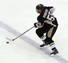 During the first game of the 2008–09 pre-season, Gonchar was hit into the boards by David Kočí in a game against the Tampa Bay Lightning, dislocating his shoulder. It was reported that he would miss four to six months after opting for arthroscopic surgery.[7] While both Gonchar and defense partner Brooks Orpik claimed the hit was late, well after Gonchar had completed a pass, it was judged by Penguins' head coach Michel Therrien to be a clean hit and that Kočí had simply "finished his check".[8][9] With the Penguins struggling to make the playoffs, Gonchar returned to play his first game of the season on 14 February 2009, against the Toronto Maple Leafs after being sidelined for 21 weeks.[10] He played in the final 25 games of the regular season and tallied 19 points, helping the Penguins into the 2009 playoffs as the Eastern Conference's fourth seed. However, playing in game four of the conference semi-finals against the Washington Capitals, Gonchar suffered a serious knee injury with a knee on knee hit by Alexander Ovechkin . Despite being initially expected to be out for several weeks and possibly the remainder of the playoffs,[11] Gonchar returned for game seven of the series.[12] Gonchar and the Penguins went on to win the Stanley Cup in seven games, facing the Detroit Red Wings for the second consecutive year. After winning, he revealed he had been playing with a partially torn medial collateral ligament (MCL).[13]