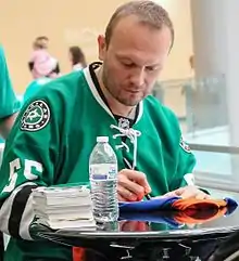 On 1 July 2010, Gonchar signed a three-year, $16 million contract with the Ottawa Senators.[16] The deal included a no-trade clause. During the 2012–13 NHL lockout, Gonchar returned to his native Russia to play with the Kontinental Hockey League (KHL)'s Metallurg Magnitogorsk. He was traded on 7 June 2013, to the Dallas Stars in exchange for a conditional sixth-round pick in 2013. On 8 June 2013, Gonchar signed a two-year, $10 million contract with the Stars.[17] The following year, on 11 November 2014, Gonchar was again traded, this time to the Montreal Canadiens for left winger Travis Moen.[18]