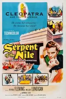 Serpent of the Nile is a 1953 Technicolor historical adventure film produced by Sam Katzman and directed by William Castle. The film starred Rhonda Fleming, Raymond Burr, William Lundigan and Michael Ansara. In an early role, actress Julie Newmar (listed as Julie Newmeyer) appears as an exotic dancer clad only in gold paint (and a gold fabric bikini of early 1950s style).[1] It also stars William Lundigan as Lucilius and Michael Fox as Octavius.