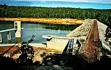 ![]() Dam wall and offtake tower. Water level in picture is 27% of capacity. | |
