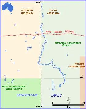 The Serpentine Lakes is a chain of salt lakes in the Great Victoria Desert of Australia. It runs for almost 100 km (62 mi) along the border between South Australia and Western Australia. When full, the lakes cover an area of 9,700 hectares (97 km2). Most of it is located in the Mamungari Conservation Park. The Anne Beadell Highway crosses the northernmost arm of the lake.