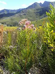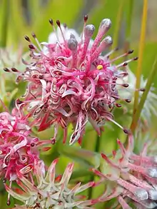 Serruria elongata or long-stalk spiderhead[3] is a plant belonging to the protea family. It is an erect, hairless shrublet of 1–1½ m (3½–5 ft) high with densely set, alternate, finely divided leaves lower down the plant, with needle-like segments. On top of an up to 30 cm (12 in) long inflorescence stalk are several, loosely arranged heads of pin-like, densely silvery-haired flower buds, each of which opens with four curled, magenta pink corolla lobes. The species is endemic to the southern Western Cape province of South Africa. It flowers during the southern hemisphere winter and early spring, between June and September.[4][5][6]