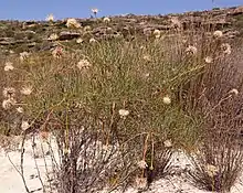 Fire destroys the plant but the seeds survive. Two months after flowering, the fruit falls off and ants disperse the seeds. They store the seeds in their nests. The plant is unisexual and pollination takes place through the action of insects. The plant grows in sandstone soil at altitudes of 700-800 m.