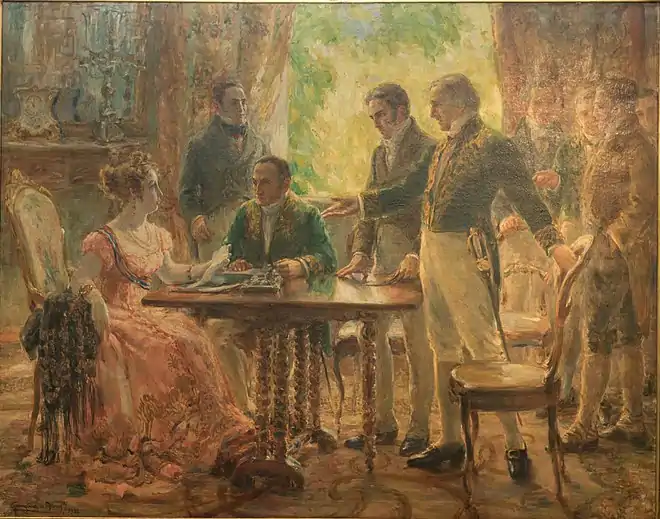 Albuquerque's intention was to portray the moment when the princess, under the advice of José Bonifácio, prepares a letter to Dom Pedro, encouraging him to end Brasil's colonial status.[4] It's in this famous letter that Maria Leopoldina writes: "The pome is ripe, harvest it now, or else it will rot".[11] Dom Pedro received the letter on 7 September 1822, the date of the "Cry of Independence".[10]