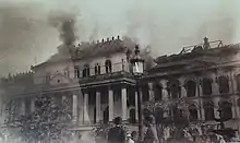 In 1934 a massive fire broke out at Seto Durbar engulfing the palace building. Historian Purushottam Shamsher says in his book that Lila Shumsher begged the then Prime Minister Juddha Shumsher to use artillery cannon to cut off the burning wing from the non-affected wing. Juddha Shumsher declined his begging saying artillery might damage Narayanhiti Palace, the Royal residence of the King.[1] Today, the only remains of Seto durbar is a building occupied by NIDC Development Bank Head Office in Durbar Marg.[5]