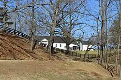 Seven Oaks Farm is a historic home and farm complex located near Greenwood, Albemarle County, Virginia. It was formerly known as Clover Plains and owned by John Garrett, who assisted with building the University of Virginia and was a bursar with the university. The land is named after the original seven oak trees on the property named after the first seven presidents born in Virginia. Only one of the original seven trees still standing after six were destroyed in 1954 in the aftermath of Hurricane Hazel. The main house was built about 1847–1848, and is a two-story, five-bay, hipped-roof frame building with a three-bay north wing. The interior features Greek Revival style design details. It has a two-story, pedimented front portico in the Colonial Revival style addition. Sam Black's Tavern is a one-story, two-room, gable-roofed log house with a center chimney and shed-roofed porch. Black's Tavern has since been moved to the adjacent Mirador property circa 1989. It was originally owned by Samuel Black, a Presbyterian minister of the Sam Black Church in West Virginia. Blacksburg, Virginia, was named after the family. Other buildings on the farm include an ice house, smokehouse, dairy, greenhouse, barns, a carriage house, a garage and several residences for farm employees. The ice house on the land, typically framed in an octagonal shape, in fact only has six sides. [3]