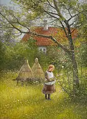 In Paris, he studied under Léon Bonnat for three years. He also learned some photography. When he returned home, he obtained some photographic equipment and took his first pictures in Halland in 1875. He often worked "in parallel", using both camera and brush. He was also one of the first Swedish documentary photographers. Inspired by Arthur Hazelius, he made photographic studies of public life, especially in the village where he was born.[1] Most of his pictures of people appear, however, to have been staged.