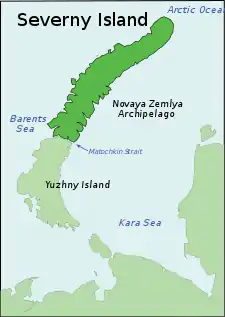 Severny Island is separated from Yuzhny Island (Southern) by the narrow Matochkin Strait. Forty percent of the island is covered by the Severny Island ice cap, which is the largest glacier by area and by volume in Europe (if counted as part of it).[3] Severny Island is known for its numerous glaciers.[4] Cape Flissingsky is the easternmost point of Severny Island.