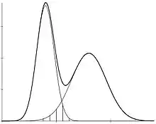 is the density of the mixture with two normal components, where are the normal densities and the mixing proportions of both sexes, respectively. See an example in Fig. 2 where the thicker curve represents the mixture whereas the thinner curves are the functions.