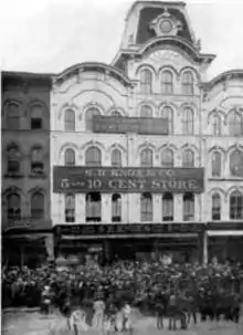 By 1889, he was able to buy out his cousins.[3] He maintained a collegial business relationship with his cousins after the buyout. In fact, he bought Woolworth merchandise at wholesale and sometimes traded in competition.[3] He formed another brief partnership with another friendly rival, Earle Perry Charlton, from 1889–1895, opening his Buffalo "S.H. Knox Co." 5 and 10 Cent Store in 1890.[3][5] In 1890, he made established headquarters in the Buffalo store.[6] Sources disagree on the chronology of later stores. One source says that the second Buffalo store was opened at 549 William Street on June 20, 1891.[4] Another says Knox opened his second store on December 18, 1893, at 519 Main Street four days after the first store at 409 Main Street was destroyed in the Wonderland Building Fire.[7] The 519 Main Street store replaced the 409 Main Street after the December 14, 1893 fire and moved to 395 Main Street in 1895.[8] He continued to build his S.H. Knox Co. 5 and 10 Cent Store empire. By the time of the 1911 incorporation of F. W. Woolworth Company, Knox was the second largest of six store operators with 98 U.S. and 13 Canadian locations. In 1912, he received $12 million of the $65 million merger proceeds and was appointed Director and Senior Vice-Principal of the Corporation.[3] Knox is remembered as the pioneering city center store operator. His Detroit, Michigan store was the first outside of the agricultural and small-market towns.[3] Many of the Woolworth friendly rivals emulated his plan.[3]