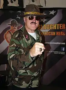 Sgt. Slaughter is a fictional character from the G.I. Joe: A Real American Hero toyline series. G.I. Joe used the fictional kayfabe persona of the American professional wrestler Robert Rudolph Remus,[1] known in-character as Sgt. Slaughter, as a model for their character. Four versions of his action figure were released in the 1980s. Sgt. Slaughter's G.I. Joe version makes no reference to its professional wrestling inspiration, although the character does use wrestling moves. Remus also did the voice for the animated character,[2] and appeared in person for introductions to the episodes that were originally G.I. Joe: The Movie. He was also the spokesman for the G.I. Joe toys from 1989 to early 1990, introducing the new vehicles and figures in commercials.