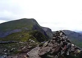 The mountains western slopes are mostly grassy with a few rocky outcrops as they drop down to the valley of the Allt Breabaig. The mountains best geological feature are its eastern cliffs, the highest in the Fannichs which fall 400 metres to the head of Coire Mòr. These Schist cliffs have attracted winter ice climbers with 20 named routes available,[4] the best known being Skyscraper Buttress and Gamma Gully.[5] Drainage from the mountain reaches both coasts of Scotland, rainfall on the west and northern slopes go via the River Broom and Loch Broom to reach the west coast at Ullapool. Drainage from the south and east flank goes south to Loch Fannich to eventually reach the east coast at the Cromarty Firth.