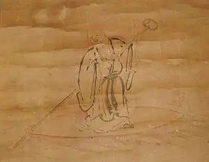 The Kyōgen-influenced Noh play shōjō or shōjō midare features a shōjō buying sake, getting drunk and dancing ecstatically, then rewarding the sake seller by making his sake vat perpetually refill itself.[9][10] The shōjō from the play have been made into wooden dolls (nara ningyō), they are one of the "most common" wooden dolls derived from Noh plays.[11] Shōjō dolls are used to ward against smallpox.[12]