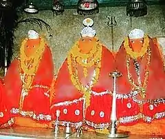 There are many dhams like mother goddess Shakambhari. But the shade of Siddha Bhawan, which sits in the wild hills of Saharanpur, is somewhat unique. At the foot of the hill is the temple of Mother. After climbing fifteen steps, the mother's wonderful form is seen. The mother is seated with her four forms and child Ganesha on a marble platform on which silver is mounted. The beautiful costumes of the four forms of Mother are embellished with gold and silver apparitions. Bhima and Bhramari to the right of Mother and to the left and Shatakshi Devi are distinguished. This is the only temple in the country where four forms of Durga are seen together. Before seeing the mother, people have to see Bhura Dev Baba. Those who joined the Dewasur Sangram sacrificed their lives. Mata Jagadamba was pleased and gave a boon to Bhuradev that whoever comes to worship me will worship the first Bhuradev. Maa Shri Shakambhari Devi Ji is Sakshat Lakshmi Swaroopa. Shakambhari Devi appeared in a self-proclaimed form on the divine hills of Shivalik at the behest of Lord Vishnu. A detailed description of the form of Mata Shakambhari is found in the Murti Rahasya chapter of Durga Saptashati. The ancient temple of the goddess Shakambari is situated at Sakarai about 15 km (9.3 mi) from Udaipur Wati, which is about 29 km (18 mi) from Sikar(Rajasthan). There is also one same sakambhari mata temple at Pakaur (Jharkhand)as same in sakarai Rajasthan 150 km (93 mi) from Kolkata Two JAGRAN Night one in chaitra saptami night and one in durga puja saptami night every year, Also there are three temples of Mata Shakambari in Kolkata. Since tears rolled out from the eyes of the goddess continuously for nine days and nights the biggest worship practice is the celebration of Navratra Mahotasav, held in the months of Chaitra and Aasoj for nine days each. Two more Navratras are also celebrated but they are known as "Gupt Navratras."