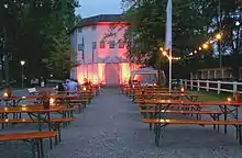 The festival features an annually changing program of up to 30 performances attracting approximately 15,000 visitors. A space utilization of 90 percent is achieved.[1] The mixture of national and international ensembles, the works of Shakespeare, partly in Original language, perform on the simple stage without elaborate backdrops, offers both faithful productions as well as contemporary arrangements and unconventional interpretations. The regular participants include the Bremer Shakespeare Company and the Rheinische Landestheater Neuss.