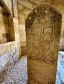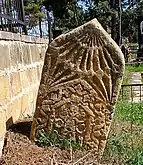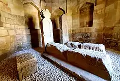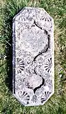 According to the local residents, Shahide-khandan (handsome merry man) was the nickname of Nasimi's brother, and the cemetery is named after him, since he was buried here.[2] In Shakhandan, the ruins of an octagonal mausoleum were discovered. Inside the mausoleum there are two graves, the headstone of one is slightly deepened into the ground. As a result of the atmospheric influences, the inscriptions were completely erased. On the reverse side of the deepened tombstone there is an image characteristic of the gravestones of Azerbaijan of the 14-15th centuries. The Azerbaijani archaeologist Huseyn Jiddi notes that this is probably the grave of "Shahide-Khandan" - Nasimi's brother. If this is true, then according to Jiddi, in the 14-15th centuries, the city's cemetery was located in this area. This is partly confirmed by other tombs of the 15th-16th centuries that are placed there. Many ancient gravestones of the cemetery have been lost, while some are underground.[2]
