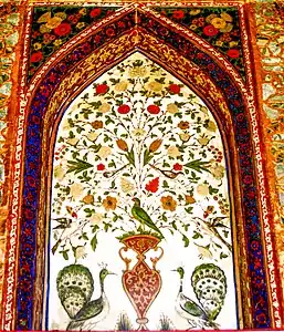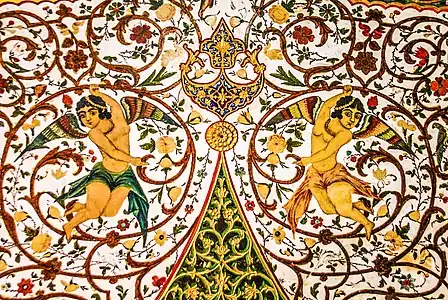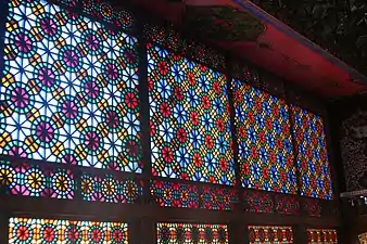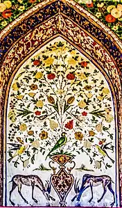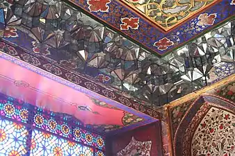 In the second floor interior, the main flooring is a decorative vine. Rectangular boards cover the walls. Wall painting subjects include Azerbaijani poet Nizami's heroes, "Seven Beauties", "Leyli and Majnun" poems and covered with a very unusual stalactite. Two types of cabinets are used. The ceiling and the cavities of the three walls pass through the shelves. Small boards are on the shelves. The sockets are decorated with flowers, animal and bird pictures in the vases. The rest of the hall, except the outer wall, is designed with a drawing ornamented "network".[1] [2] [3]
