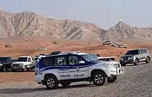 The Sharjah Police uniform is either green with a red cap and epaulettes or blue/grey with a blue cap. Police cars are blue and white, including those of the 'Anjad' patrol.