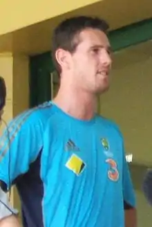 Shaun William "The Wild Thing" Tait (born 22 February 1983) is a former Australian professional cricketer who was appointed as the bowling coach of the Pakistan national cricket team in February 2022.[1] He played as a right arm fast bowler[2] and represented Australia in all three forms of cricket, but had most success in One Day Internationals, in which he was a member of Australia's undefeated team at the 2007 Cricket World Cup, and Twenty20 cricket. Tait won four different awards throughout his career including the Bradman Young Cricketer of the Year in 2004.[3] He was one of the fastest bowlers in the world during his time.