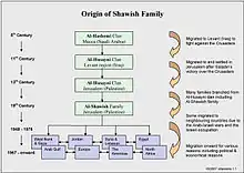 During the periods of Ottoman Empire and British Mandate of Palestine, and due to significant historical and political events in Jerusalem, some Al-Husayni individuals adopted new surnames drawn from their professions.[2] Within the Shawish family, it is widely believed that the name Shawish (meaning Police or Army Sergeant) originated from a policeman in the Old City of Jerusalem at that time, around the end of the 19th century.