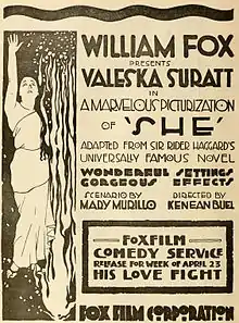 She is a 1917 American silent fantasy adventure drama film directed by Kenean Buel and produced and distributed by the Fox Film Corporation.[1] It was loosely based on H. Rider Haggard's oft filmed 1887 best-selling novel, She: A History of Adventure.[2] Now considered lost,[3] the film starred Valeska Suratt and Ben Taggart.