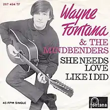 Wayne Fontana and the Mindbenders had enjoyed a cross-atlantic hit with the song "The Game of Love", which topped the Billboard Hot 100 and reached number two in the UK's Record Retailer in mid-1965.[1][2] The song was composed by Clint Ballard Jr., who with it proved that he could pursue a career in songwriting.[3] Knowing that the Mindbenders had made it big, he offered them another of his compositions, "It's Just a Little Bit Too Late" which was released in the summer of 1965 and became a minor hit on both Billboard Hot 100 and Record Retailer.[1][2] Unlike "The Game Of Love", "It's Just A Bit Too Late" failed to reach the top-ten, peaking at number twenty on the latter chart.[2] This led to suspicion of the group becoming a one-hit wonder or eventually breaking up.[4] In a last resort, they gave another Ballard Jr. composition a chance, this being "She Needs Love" being produced by Fontana Records house producer Jack Baverstock.[5] The single was eventually released on 10 September 1965 through Fontana.[6]
