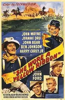 She Wore a Yellow Ribbon is a 1949 American Technicolor Western film directed by John Ford and starring John Wayne. It is the second film in Ford's "Cavalry Trilogy", along with Fort Apache (1948) and Rio Grande (1950). With a budget of $1.6 million, the film was one of the most expensive Westerns made up to that time. It was a major hit for RKO. The film is named after "She Wore a Yellow Ribbon", a popular US military song that is used to keep marching cadence.