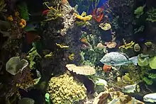 The Caribbean Reef exhibit was built in 1971, on the site of the aquarium's very first exhibit, the Tropical Pool. A feature of this exhibit is a diver that interacts with the animals while talking with the people. A part of the exhibit is a 90,000-US-gallon (340,000 l) circular tank that allows for maximum walk-around viewing. It was one of the first habitats to display schooling fish. It is also home to the rescued green sea turtle, Nickel, as well as Atlantic tarpons, cownose rays, redband parrotfish, Bonnethead sharks, a Green moray eel, and many more species. The exhibit is near the center of the first floor. It is adjacent to Amazon Rising, Waters of the World, and Wild Reef.