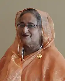 Sheikh Hasina Wazed (née Sheikh Hasina ; /ˈʃk həˈsnə/ SHEKH ha-si-na; Bengali: শেখ হাসিনা ওয়াজেদ, romanized: Shēkh Hasinā, [ˈʃekʰ ɦɐsina]), born 28 September 1947,[1] is a Bangladeshi politician who has been serving as the Prime Minister of Bangladesh since January 2009. Hasina is the daughter of Bangladesh's Founding Father and first president, Bangabandhu Sheikh Mujibur Rahman, and the eldest of his five children.[2] She previously served as prime minister from June 1996 to July 2001. She is the longest serving prime minister in the history of Bangladesh, having served for a combined total of over 18 years. As of 6 May 2022, she is the longest serving elected female head of government in history.