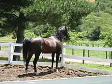 Varian did not originally work her ranch name into the names of her horses, but today all Varian-bred horses have a registered name suffixed with the capital letter "V".[51][52] The Varian ranch also acknowledges the importance of the mares by using the first letter of each mare's name to start the name of their foals.[9][53] Varian-bred horses are freeze branded with the Varian "V" logo.