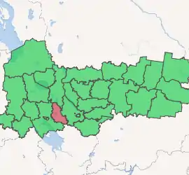Sheksninsky District (Russian: Шексни́нский райо́н) is an administrative[1] and municipal[8] district (raion), one of the twenty-six in Vologda Oblast, Russia. It is located in the center of the oblast and borders with Kirillovsky District in the north, Vologodsky District in the east, Poshekhonsky District of Yaroslavl Oblast in the south, and with Cherepovetsky District in the west. The area of the district is 2,500 square kilometers (970 sq mi).[4] Its administrative center is the urban locality (a work settlement) of Sheksna.[3] Population: 33,375 (2010 Census);[5] 36,007 (2002 Census);[10] 34,679 (1989 Census).[11] The population of Sheksna accounts for 62.8% of the district's total population.[5]